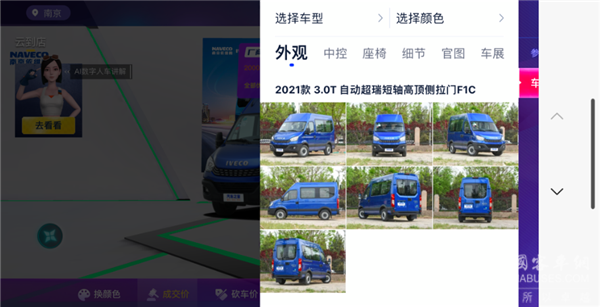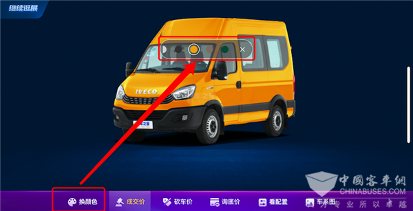 云车展期间,用户可以再依维柯云车展展台选择“2D净享看车”,也可以选择360度净享看车前脸、轮毂、车厢……环绕式体验,每个车身细节一览无余;还可以点击“换底色”,为心爱的依维柯换装;AI数字人车讲解展厅全面解答车型亮点,打造身临其境的看车体验;还可以点击“砍车价”,与工作人员来一场关于砍价的Battle,趣味满满!