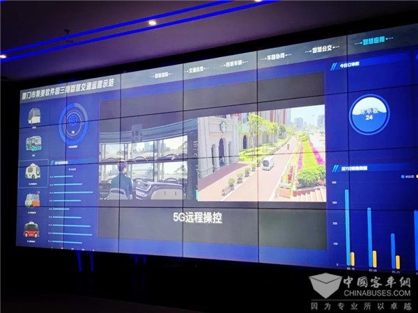 在金龙逍遥上,通过两块区域的显示屏,阿龙可以直观的、全面的了解到此次试乘活动中智能交通功能的细节与变化。网联化智能监控、特种车辆提醒、盲区预警功能、绿波通行等车路协同功能保障了车辆安全行驶。