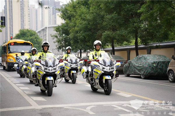 西安公安交警支队未央大队专门安排骑警前往现场,为这一次特别的儿童交通安全教育课堂助力护航。