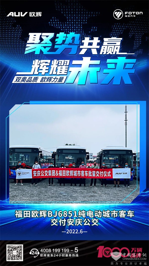 2022年6月14日,批量欧辉BJ6851纯电动城市客车成功交付安庆市公共交通集团有限公司(简称“安庆公交”),为安庆市民出行提供更加低碳环保、安全舒适的新能源公交服务。