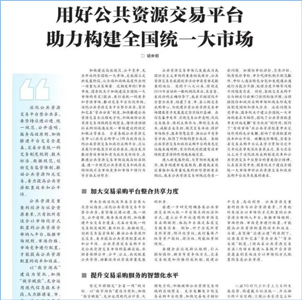 这篇题为《用好公共资源交易平台 助力构建全国统一大市场》的文章指出,进入新发展阶段,与贯彻新发展理念、服务构建新发展格局、推进湖北省疫后重振和高质量发展的新形势新要求相比,该省公共资源交易领域还存在一些问题。如围标串标泄标、恶意评标、低质低价中标、中介代理机构不规范操作、中标人违法转包分包和发现违法违规行为能力不强、处理力度不够等问题不同程度存在。同时,各级交易采购平台与相关行政部门协同衔接不够,治理招投标和政府采购市场环境未形成有效制度闭环和强大合力。这些问题与建立全国统一大市场的要求不相符,弱化了公共资源配置中更好地发挥“有为政府”的作用,制约了“有效市场”在公共资源配置中决定性作用的充分发挥,影响了资源配置的效率和公平性。为破解这些难题,湖北省将加大交易采购平台整合共享力度,提升交易采购服务的智慧化水平,加快推进公共资源交易全流程电子化,积极破除公共资源交易领域的区域壁垒,营造阳光招标采购环境,以公开促公正。