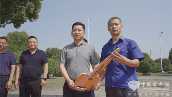 亚星总经理贾开潜向磐石隆达实业集团董事长王强交付金钥匙,随后,一辆辆崭新的亚星纯电动豪华定制公交车驶出厂区,它们将上线磐石市。
