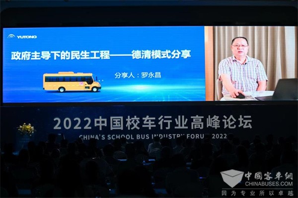 十年间,全国各地也涌现了许多校车发展的先进典型,其中的优秀代表德清县永安学生交通服务管理有限公司、广东侗安校车服务有限公司、安徽护萌校车服务有限公司分别进行了分享发言。德清作为中国校车发展的先行地区闻名全国,德清县教育局原纪委书记、《中国校车》的作者罗永昌以视频的形式和大家分享了“德清模式”12年发展之路。“‘政府主导’”是‘德清模式’成功的关键,如果地方政府没有把校车工程当成是民生工程,就做不好这件事情。”罗永昌强调,而在这一过程中,宇通校车发挥了重要作用。