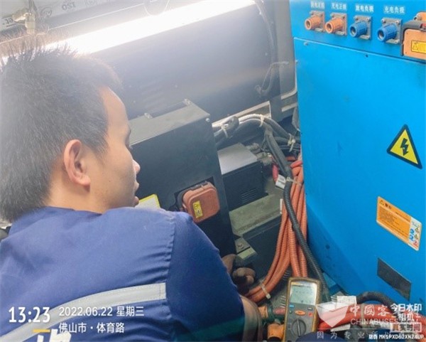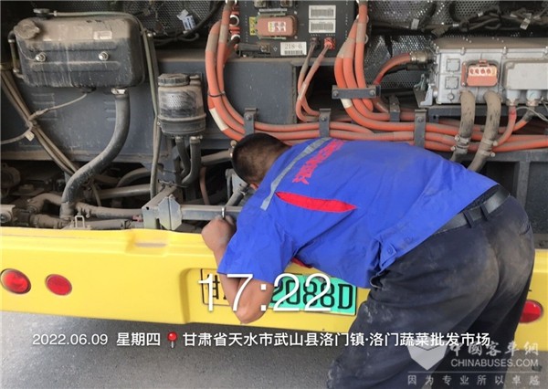 6月25日,郑州国家气象站发布的监测气温超过40℃,苏州金龙驻郑州服务工程师郜翔带领新郑凯程服务站人员主动上门服务,在新郑市新通公交分公司华南城场站、城关乡场站、西亚斯场站三个场站之间,顶着高温在车辆中来回穿梭,按照夏季服务活动检查项目表逐一对照,对车辆高压系统绝缘性、电池冷却系统、打气泵滤芯等28个项目逐项进行检查、保养,并对关键项目拍照、记录。在客户配合下,服务团队分工协作,于7月初完成了该公司70台6米新能源客车安全检查任务。