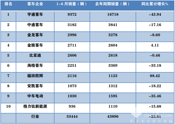 宇通累计客车销量9372辆夺冠,但同比下降43.94%,是销量降幅最大的车企;中通客车累计销量3182辆,同比下降17.16%,位居第二;金龙客车累计销量2996辆,同比下降8.6%,位居第三;金旅客车累计销量2711辆,同比增长4.11%,位居第四;比亚迪客车累计销量2606辆,同比下降0.46%,位居第五;海格客车累计销量2251辆,同比下降33.18%,位居第六;福田欧辉客车累计销售2116辆,同比增长88.42%,是Top10中同比增长最快的车企,居第七。上述可见,在今年上半年的大中型客车领域,业内传统的强势品牌“两通三龙”+比亚迪+福田欧辉,占据了行业前7名的席位,而且累计销量超出2000辆。