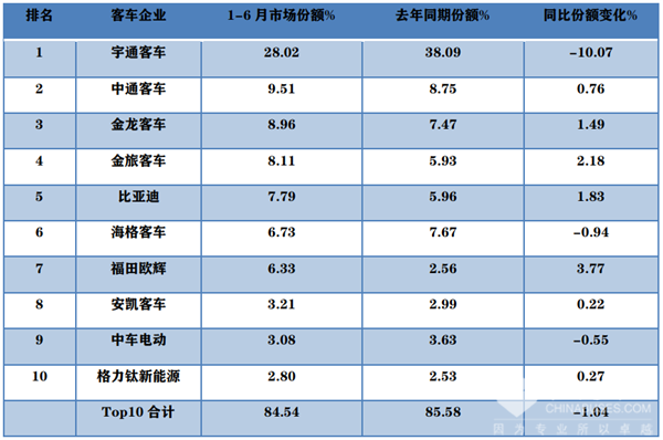 上表显示,在2022年上半年大中客车Top10市场份额及同比份额变化情况:
