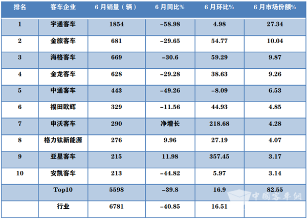 宇通客车6月销量1854辆霸榜,也是行业销量唯一超出1000辆级别的企业,同比下降58.98%,跑输客车大盘,环比增长4.98%,是第二名销量的近2.7倍,占据的市场份额近3成(27.34%),可谓独占鳌头;金旅客车销量681辆,位居第二,同比下降29.65%,跑赢客车大盘,环比增长54.77%,占比10.04%;海格客车销售669辆,居第三,同比下滑30.6%,跑赢大盘,环比增长59.29%,占比9.87%;金龙客车销量628辆,位居第三,同比下降29.28%,跑赢客车大盘,环比增38.63%,占比9.26%;中通客车销量443辆,同比下降49.26%,跑输客车大盘,环比下降8.09%,占比6.53%,位居第五;福田欧辉客车销量329辆,同比下降11.56%,跑赢客车大盘,环比增长44.93%,位居第六;申沃客车销290辆,同比属于净增长,环比增长218.68%,占比4.28%,位居第七;格力钛新能源客车销量276辆,同比增长9.96%,跑赢客车大盘,环比增长27.19%,占比4.07%,位居第八;亚星客车销售215辆,同比增11.98%,是Top10增幅最大的车企,跑赢客车大盘,环比增长357.45%,也是Top10环比增长最大的车企,占比3.17%,位居第九;安凯客车销售213辆,同比下降44.82%,跑输客车大盘,环比增长5.97%,占比3.14%,位居第十。