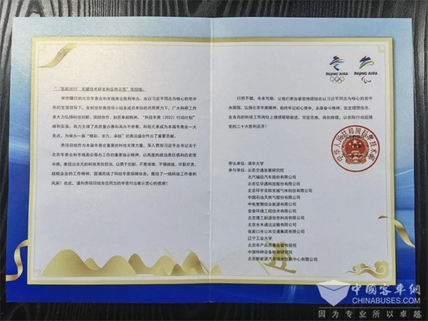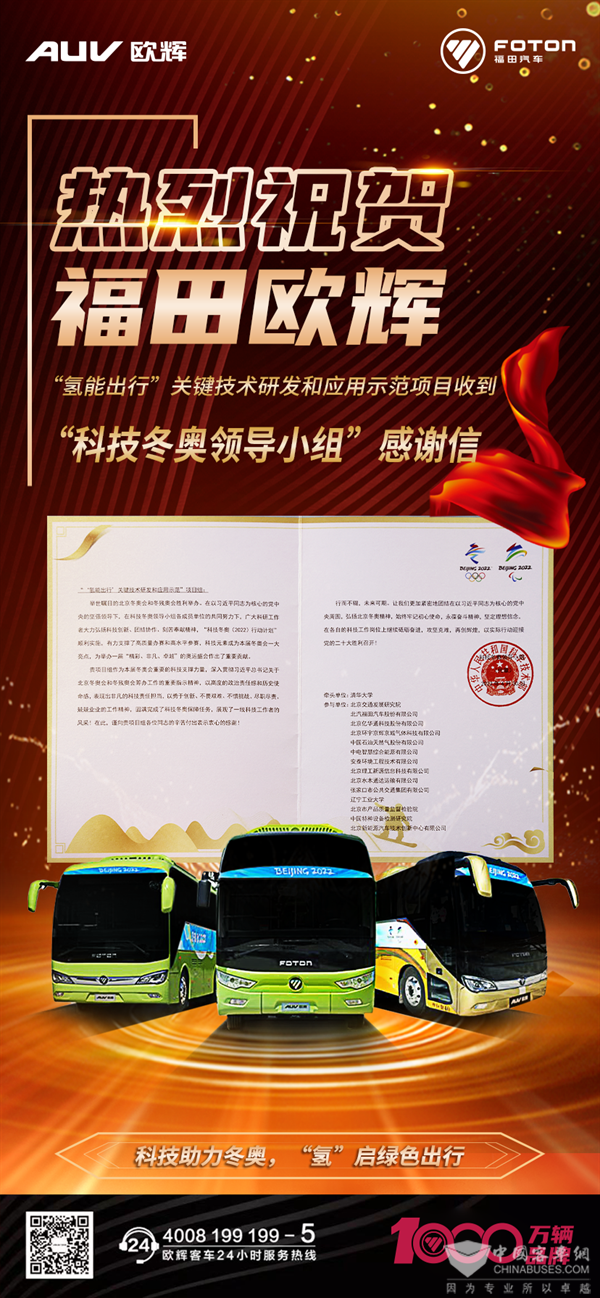 一封来自“科技冬奥领导小组”感谢信!福田欧辉燃料电池技术再获认可