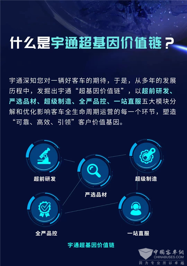 何为“超基因价值链”,宇通客车表示,“超基因价值链”包含超前研发、严选品材、超级制造、全严品控、一站直服5大方面,也即从洞察用户需求出发,对研发设计、车辆选材、生产制造、质量验证、售后服务等影响车辆全生命周期运营的环节进行改善和提升。