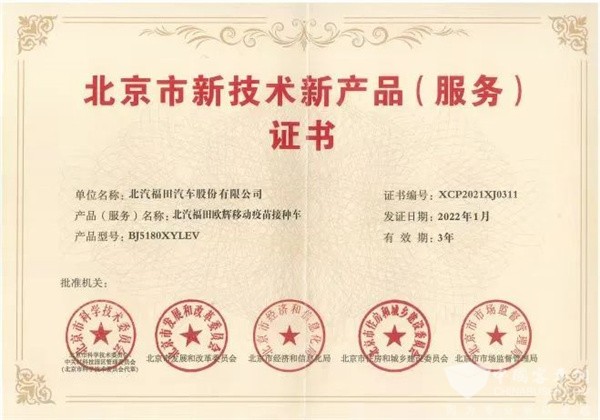 1月29日,北汽福田欧辉移动疫苗接种车成功通过“北京市新技术新产品(服务)”认定;