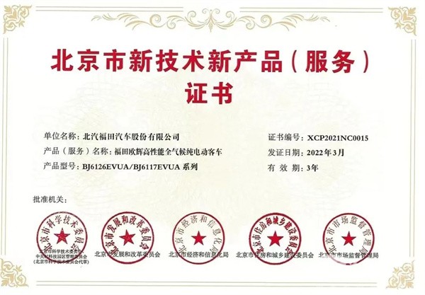 3月17日,福田欧辉BJ6126&BJ6117系列高性能全气候纯电动客车经过严格评审,顺利通过“北京市新技术新产品(服务)”权威认证!