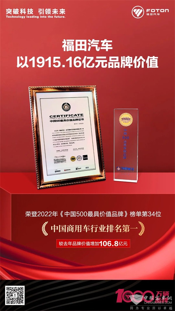 2022年7月26日,在北京举行的第十九届世界品牌大会上,福田汽车以1915.16亿元的品牌价值,再创历史新高,连续18年将最具价值商用车品牌的荣誉收入囊中,这不仅是市场对福田汽车产销持续领先上涨势头的肯定,更是对其“以用户为中心,通过创新科技构建低碳、智能、高效、共赢,打造让用户自豪的世界级科技品牌”战略的褒奖。