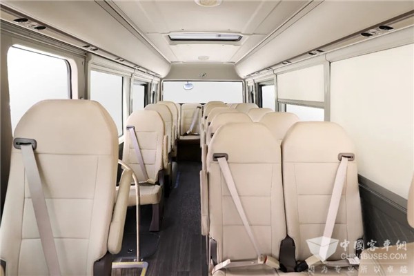 内饰应用轿车化设计理念和轿车化工艺,时尚优雅,优化NVH,车内静谧安逸。独有的内环境管理系统,新风换气,时刻保持座舱空气清新,为商务会议、领导洽谈、团体出行营造舒适氛围。