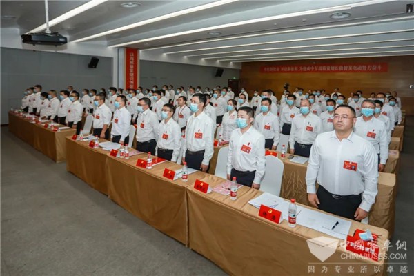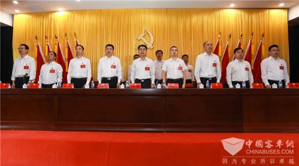 会场气氛庄重热烈,全体代表精神饱满。主席台正上方悬挂着“中国共产党中车时代电动汽车股份有限公司第一次代表大会”的会标,主席台正中间的金色党徽熠熠生辉,十面鲜艳的红旗分列两侧。