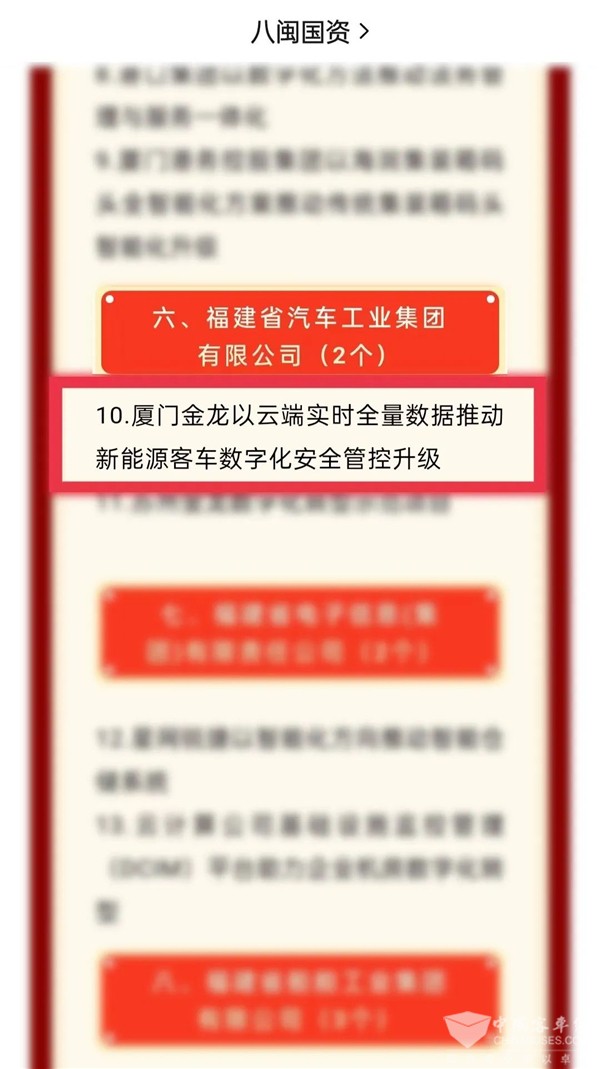 2022年8月18日,由福建省人民政府国有资产监督管理委员会、福建省企业与企业家联合会联合主办的“福建省国资系统第四届数字化转型论坛暨国企数字化转型应用场景和典型案例发布会”在福建福州成功举办。本次论坛还举行了福建省国资系统数字化转型应用场景和典型案例发布仪式,金龙客车以云端实时全量数据推动新能源客车数字化安全管控升级的案例顺利入选。该案例有效改善了新能源客车的安全问题。