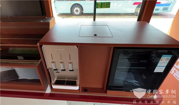 贴合城市旅游观光巴士特点,海格客车在一层前部特别设置有城市文化展示橱窗+吧台设计,其中展示柜可以放置当地旅游文化特色产品展示,吸引乘客关注更多城市信息;吧台设计,放置了饮水机带冰箱,同时车辆后部还有自动售货机组合设计,当乘客口渴了可以直接扫码购物,非常便利。