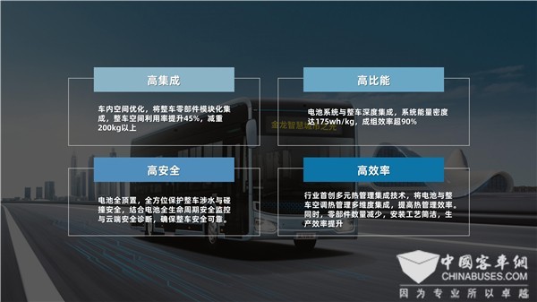 金龙MTV技术,即指将电池模组与整车深度集成,同时基于模块化思想将整车其他零部件如空调、热管理机组等与整车实现深度集成的技术,具有高集成、高比能、高安全、高效率的优点,让车身与电池结构互补,让动力电池系统能量体从以往的独立部件成为车辆的结构件,相对于传统客车来说,MTV技术不但是技术上的革新,也是思维上的创新。