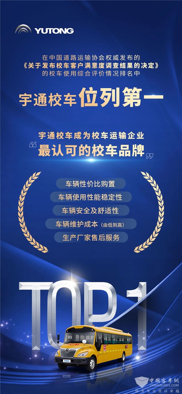 宇通校车能在众多品牌中脱颖而出,拿下五个第一,有力证明了行业对宇通校车质量及服务的认可。
