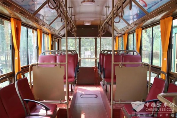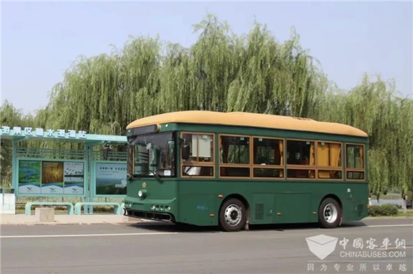 格力钛新能源铛铛车,外形酷似民国有轨电车,车身喷涂“青碧绿”亚光油漆,搭配皮革座椅,铺设棕红色地板、仿古黄车顶、仿旧顶灯和别致手环,以现代工艺呈现复古韵味;具有零排放、噪音小等特点,在保护自然生态系统的同时,推进景区生态环境治理工作,助力景区旅游发展。