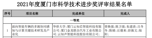 2022年 3月,金龙客车与华侨大学、厦门云知芯智能科技有限公司、云知声智能科技股份有限公司联合项目《面向智能车辆的多源协同感知与计算关键技术研发及产业化》荣获“2021年度厦门市科学技术进步奖一等奖”。