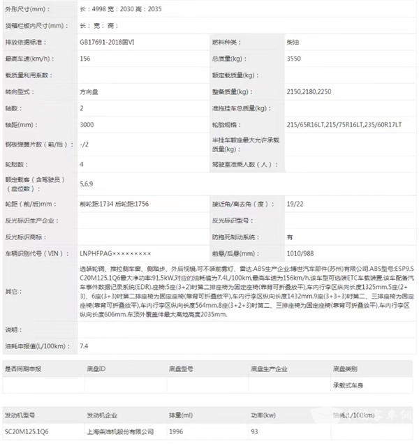 外观方面,整车尺寸为4998x2030x2035mm,该车看起来更像是MPV造型,偏向乘用化,车身造型流畅,年轻时尚;空间方面,从本次申报信息展现来看,新车将采用5-9座的布局,并且座椅靠背可折叠放平,能够满足不同人群的用车需求;从申报图信息可以看出,新车搭载了SC20M125.1Q6柴油发动机,功率最高可达93kW,符合国六b排放标准,百公里油耗为7.4升,最高车速为156km/h。