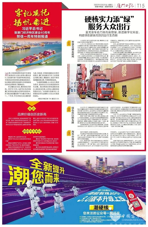 牢记嘱托走在前,勇担使命开新局。2021年12月,习近平总书记在致厦门经济特区建设40周年的贺信中,把“推动高质量发展”作为重点任务之一。作为中国大众交通的参与者、创造者、引领者和富有社会责任的国企,厦门金龙联合汽车工业有限公司一年来,勇立潮头、勇毅前行,坚定不移走高质量发展之路,不断取得新成效。