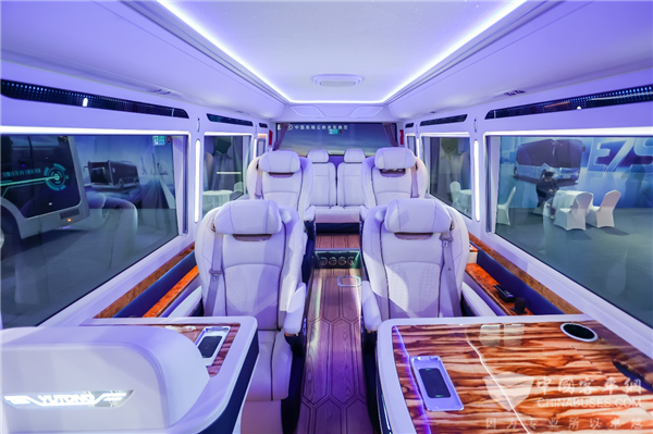 在人性化和智能化方面,T7星辰版还配备原厂豪华航空座椅,搭配龙血檀木木纹桌面,配以抽纸盒、高级水杯支架、无线充电位,配备50升大容积冰箱、高档酒柜、32寸高清投屏电视、车载Wi-Fi、集成式空气净化器等一系列公商务高端办公需求设备,打造极致享受与品位。