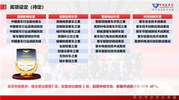 评选下设“品牌影响”、“智能电动”、“科技创新”、“定制应用”四大乐章,近30项细分成果奖项,全方位盘点、筛选、表彰中国客车行业在品牌建设、智能网联化趋势、科技创新成果、客车产品定制应用等方面表现杰出的企业与产品。回顾2022年度行业见解与成果,展望2023年度行业热点与趋势。