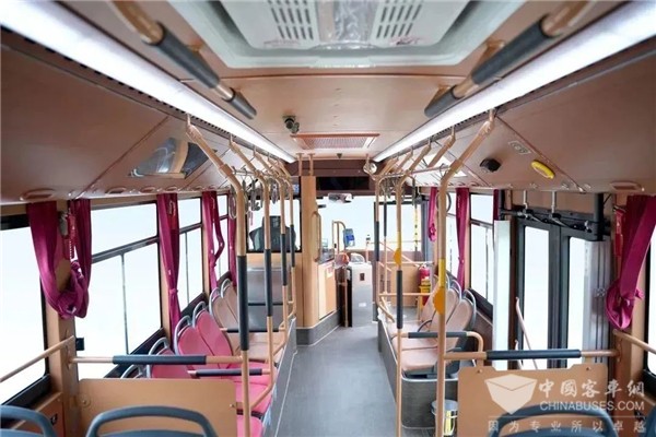 复古的车厢内部有别于传统公交车的设计风格,采用软皮舒适座椅,辅以古色古香的地板、窗帘及各类装饰板件,为车厢平添了一丝古典清雅气息;LED贯通式灯带与复古内饰完美融合,精致由内而外。