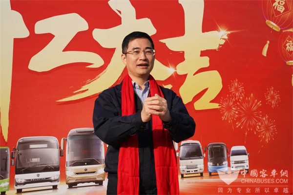 金旅客车董事长彭东庆作开工致辞:“春节前夕,蒙古、哈萨克斯坦等海外批量订单陆续发运,今天是开工第一天,公司在最近将迎来销售、生产的新高峰,将有国内外大批量订单陆续发运。衷心祝愿大家在新的一年里,身体健康、工作顺利、开工大吉!”