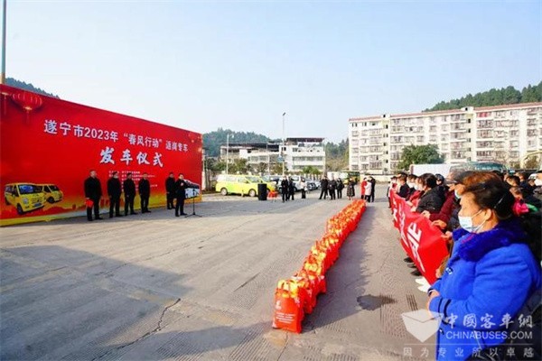 2023年1月29日,四川遂宁市“春风行动”返岗专车发车仪式现场,两辆苏州金龙海格KLQ6125大巴车从遂宁城北客运站缓缓驶出,分别驶向距离遂宁近1500公里的广东顺德、东莞,专车运送105名遂宁外出务工人员踏上返岗复工路。“返岗专车便捷又温暖,让返岗路不再漫长”,坐上首批返岗专车的外出务工人员林华感慨地说。