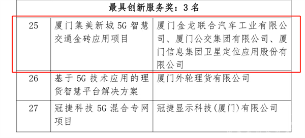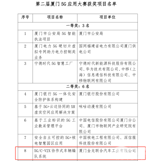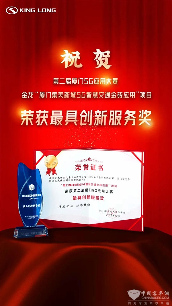 2023年2月23日上午,由厦门市工业和信息化局、厦门市大数据管理局、厦门市通信管理局、厦门市集美区人民政府共同主办“第二届厦门5G应用大赛”圆满收官。大赛上,经专家评审以及组委会核准,金龙客车《厦门集美新城5G智慧交通金砖应用项目》荣获“最具创新服务奖”,《5G/C-V2X协作式车辆编队系统》荣获“二等奖”。