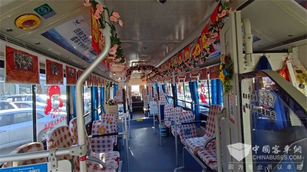 整车车身,以彰显奉献的红色为主基调,车内增添雷锋元素,使“弘扬雷锋精神 争当振兴先锋”等主题标语醒目又不失单调。充分利用公交车身、车内灯箱、挡板、座椅和顶棚展示雷锋精神,传承红色基因,成为沈阳街头一道亮丽的风景线。