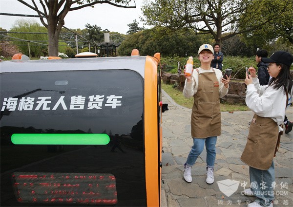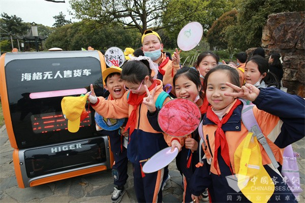 在牡丹园内,黄黑配色的无人售货车载着满车的饮料、零食自动沿着花丛间的石板小路绕行,恰逢苏州工业园区星洋学校三年级的小学生们到尚湖春游,他们很快将无人售货小车“包围”了。同学们隔着玻璃窗,看着比自己高不了多少的售货车里装满的零食,提出了很多问题和思考。“这是什么车?”“我要怎么买饮料?”“它为什么遇到人就会自动停下来?”对于同学们热情的提问,苏州金龙智能网联工程师司炎鑫耐心地一一做出解答。据司炎鑫介绍,该款无人售货车其实是结合了苏州金龙无人驾驶技术和自动售卖机技术的一种新型便民化的产物。游客们通过微信小程序选择需要的商品(如购买饮料等)、在网上支付生成提货码,云端根据游客指定取货点位置和车辆当前位置自动规划出一条行驶路线,同时发送指令给无人售货车。车辆自动驾驶系统接收到云端规划的路径地图后,即会启用自动驾驶功能,安全行驶至客户指定地点,待客户输入提货码取走商品,无人售卖车再驶向下一个目的地。