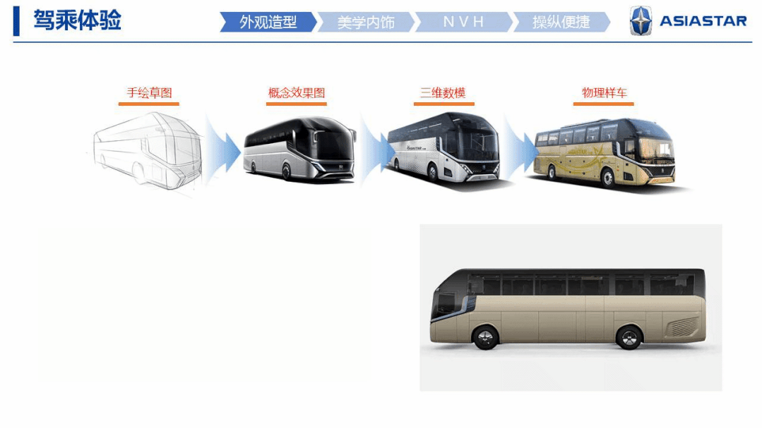 以亚星X9-3为例,该车定位于国内高端旅游和海外高端市场,代表了亚星客车高端旅游客车的全新平台。车辆外观由宾尼法利纳公司设计,采用后倾式前挡风玱璃,风阻更低;后围黄金比例分隔+框线型后尾灯,更加时尚大气;侧围亮条像Y、前围下部像X,寓意为亚星;仪表台采用面向驾驶员的“动态环绕IP结构”,强调舒适性;多功能方向盘、全液晶仪表、中控智慧大屏等,提升了智能化水平。