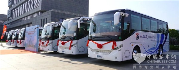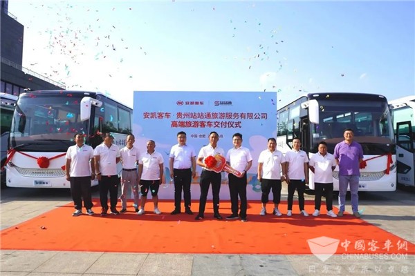 2023年6月9日,一辆辆外观清新淡雅的安凯N8身披红花,绽放“微笑”,停放在安凯厂区中央,即将交付贵州站站通旅游服务有限公司(以下简称贵州站站通公司)。