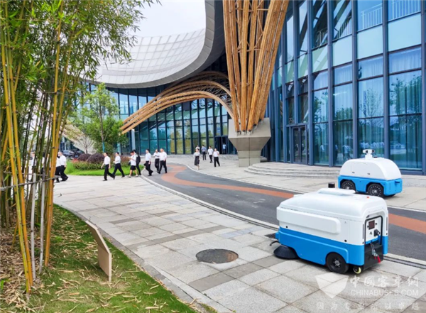 除了无人驾驶微巴外,中车电动无人安防车、无人清扫车也尤为引人注目。在储能站等园区,2辆无人安防车正在按巡检线路进行全方位流动感知,该车可实现L4级自动驾驶,顶部设有360度旋转摄像头,最高车速为15km/h,可通过地面环境感知、视频监控、语音提醒、一键呼叫等完成无人巡检工作。