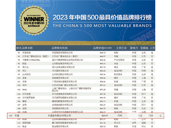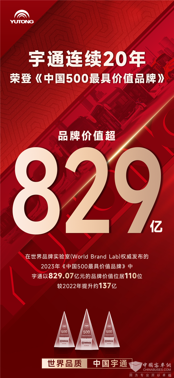 突破829.07亿!宇通连续20年上榜《中国500最具价值品牌》