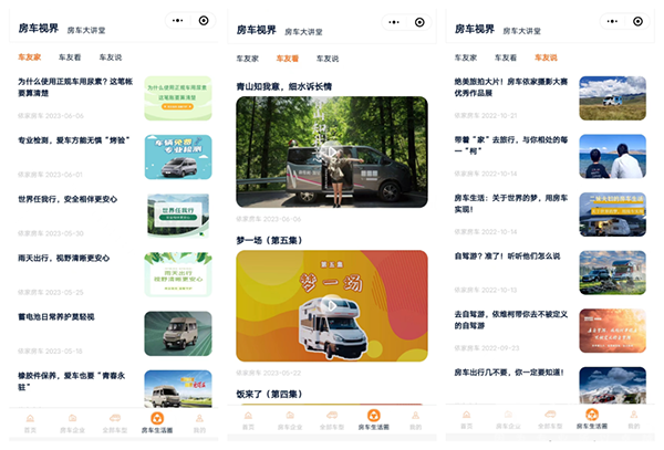 旅行的意义除了领略不同的风光,也在于结交志同道合的朋友。依家房车小程序2.0版本的房车生活圈,汇集车友家、车友看、车友说,聚集了一批热爱房车旅行的朋友。在这里你可以查看房车资讯、分享你的旅行见闻,还可以看看别人走过的路、看过的景,一起开着房车去远行。