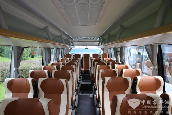海格途悦车如其名,是一款让旅途愉悦的车型。在途悦车型设计时,设计团队缩短了前后围,车辆内部空间感特别强;37+1的座位数实现了8米段客车最优布置,2+2商务座椅乘坐相当舒适;环保内饰的颜色搭配也更加强调舒适性和乘坐体验。