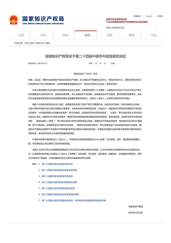 中国专利奖是我国专利领域的最高奖项,由中国国家知识产权局和世界知识产权组织共同评选,是我国唯一对授予专利权的发明创造给予奖励的国家级奖项,代表着中国自主创新的最高水准,得到联合国世界知识产权组织(WIPO)的支持与认可,在国际上具有广泛的影响力。