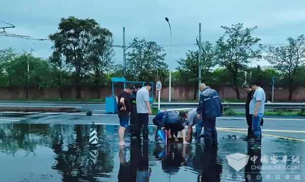 在保证生产的同时,欧辉新能源客车积极开展各项关于安全生产的活动。自6月1日“入汛”以来,欧辉新能源客车各区域应急队伍24小时值守,及时通报预警预报。面对本次台风天气降雨持续时间强、降雨强度大等特点,欧辉新能源客车每日安排40名防汛工作人员,24小时在岗、在职、在责。防汛值守人员紧盯雨水箅子、防汛水泵和雨水提升泵,以防排水设施堵塞影响泄洪排水能力,同时对移位井盖及时采取安全护笼等应急措施,确保道路交通安全。