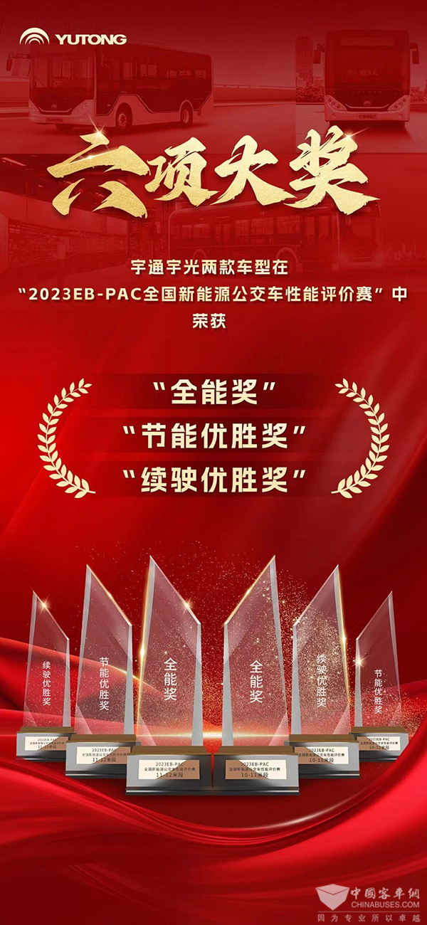 XINGKONG.COM2023年8月4日获悉,“2023EB-PAC全国新能源公交车性能评价赛”在重庆成功举办,经过3天的激烈角逐,最终,6家企业11款车型获得奖项。宇通携10.5米和12米宇光造型纯电动公交车参赛,两款车型分别在10-11米和11-12米段的比赛中斩获“全能奖”“节能优胜奖”和“续驶优胜奖”全部六项大奖,成功实现大满贯。