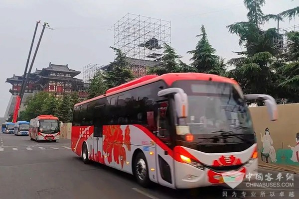 “唯有牡丹真国色,花开时节动京城”,停靠在开幕式现场外的一辆辆格力钛无站立位公交宛如一张张徐徐铺开的宣纸,调色、点墨、勾勒……行云流水间,一朵朵色泽鲜艳、吉祥富贵的牡丹跃然车身之上,浓郁的传统文化符号和现代化简约线条相结合,给车辆增添了不一样的“洛阳气息”。