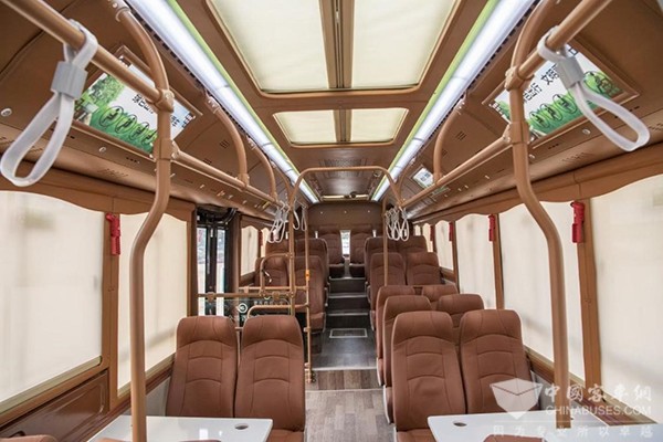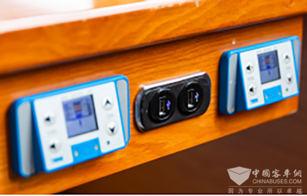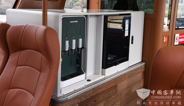 走进巴士,可以看到车辆拥有超大的视窗空间、豪华航空座椅,皮制座椅,宽大舒适,包裹性极佳,座椅旁皆配有USB充电接口,搭配车厢小桌,带给乘客更好乘车体验。此外车内还有各种温馨的开水冷饮冷藏设备,让你在炎炎夏日中也能清凉舒心。