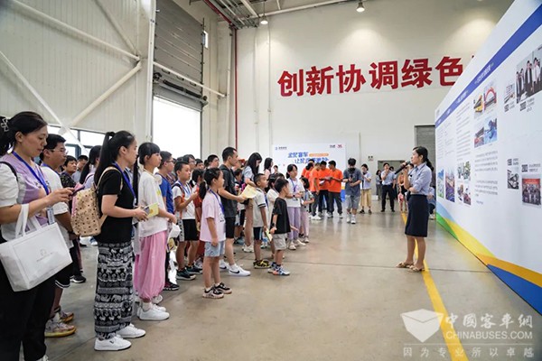 在企业文化展示区,金旅公司特地设置了企业文化墙,展示金旅的历史、荣誉以及企业核心价值观。通过现场讲解员的讲解,家属们对金旅客车的企业文化和汽车制造过程有了更深入的了解。