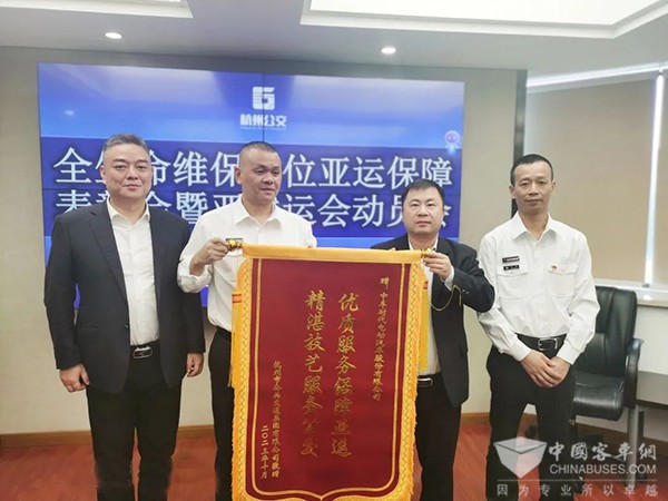 2023年10月12日,杭州公交集团相关负责人一行将一面写有“优质服务保亚运,精湛技艺服务公交”的锦旗赠予中车电动,究竟是什么事,让杭州公交如此表示感谢?