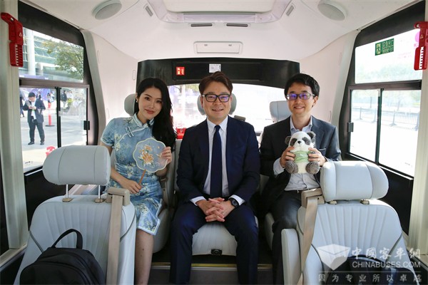 来自东京的两位日本嘉宾在大会开幕式当天乘坐了苏州金龙海格L4级无人驾驶清源小巴,从酒店到达博览中心会场。