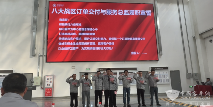 大会开展了质量宣誓环节,生产总监白旭辉带领八大战区交付与服务(交付)总监开展就职宣誓,八大战区承诺快速响应客户需求,提升订单交付能力,确保每一个订单按期高质量交付做好车辆全生命周期闭环管理,赢得客户信任。