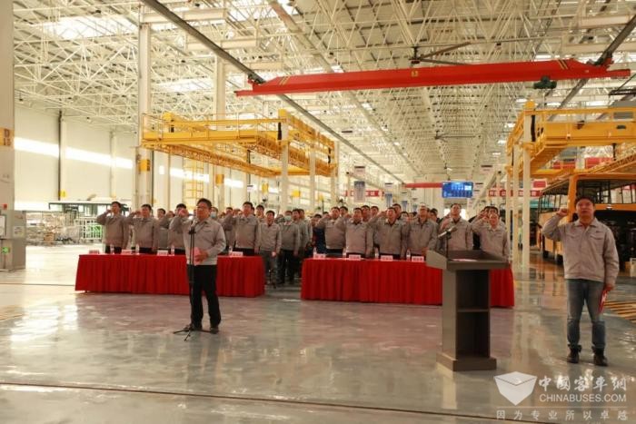 研发副总裁刘继红带领全体员工开展二代通学车质量宣誓,要求全体员工牢记国家、社会、企业使命,继续发扬“敢闯、敢试、敢赢”的奋斗者精神,确保二代通学车高标准高质量按期交付。